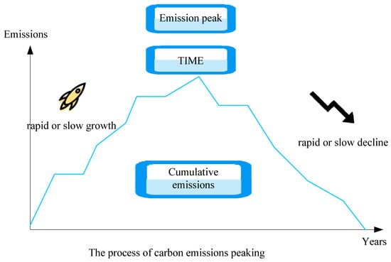 The carbon in “carbon peak and carbon neutrality” refers to the carbon dioxide emitted in the process of social production, which is a long-term process. As a new form of environmental protection, it has been adopted by more and more large-scale activities and conferences that promote green lifestyles and production and realize the green development of the whole of society. In social production, carbon emissions enter a period of rapid or moderate growth early on. China plans to reach the peak of its total domestic carbon emissions by 2030, entering a plateau period for peak carbon emissions. During the platform period, the social carbon emissions will fluctuate within a certain range, but the total amount will remain unchanged and the platform period will be longer or shorter. China plans to gradually achieve a rapid or slow decline in overall social carbon emissions after the plateau period by means of industrial structure upgrading, supply-side reform, regional economic integration, ecological nature protection, and energy utilization efficiency improvement. Ultimately, before 2060, efforts should be made to achieve the neutralization of carbon emissions in the whole industry; that is, to offset carbon emissions in social production and achieve the goal of “net zero emissions” [], as shown in Figure 1.