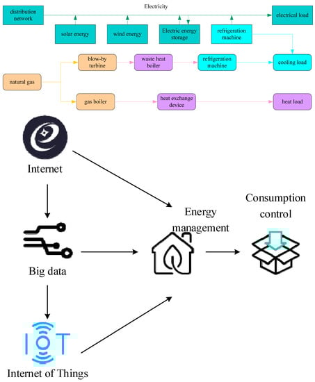 Community-level user-side distributed energy system, as the basic product of intelligent building platform technology promotion, is very important. It uses the latest technologies such as the integrated Internet, big data, and the Internet of Things, and takes building energy management as the core to scientifically select and standardize energy consumption control and management schemes to realize building intelligence, and achieve the comprehensive effect of energy conservation and emission reduction. It improves building quality while maintaining building comfort, flexibility, safety and reliability. Currently, various low-carbon solutions are employed for building energy supply through various distributed energy systems distributed in buildings []. Its basic structure is shown in Figure 3.