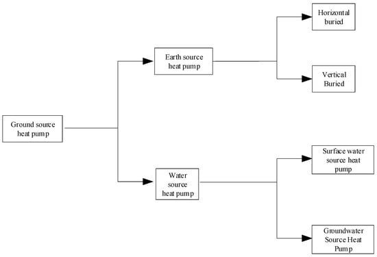 The ground-source heat pump system is a new type of environmental protection energy utilization system that uses shallow ground heating and cooling technology. The ground energy heat pump system is the backbone of the sustainable digital marketing model, and its position in sustainable development is very important. As one of the large fixed reserves and stable new energy forms in the world, ground energy has great development potential and has been vigorously promoted in fields such as power generation, building heating and cooling. Generally, the utilization of geoenergy is divided into three utilization types: shallow geothermal energy, mid-deep hydrothermal geothermal energy and hot dry rock []. Shallow geothermal energy has many advantages, such as wide area, large reserves, strong regeneration capacity, and high utilization efficiency. It can be extracted and utilized through heat pump technology, which can not only satisfy the heating and cooling of buildings, but also reduce carbon dioxide emissions and weaken the impact of greenhouse effects [], as shown in Figure 4.