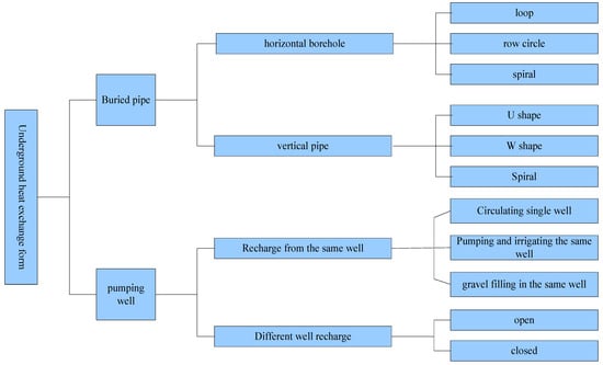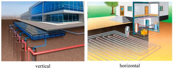 In the process of exploring geothermal exploitation and utilization, various localities have also found new methods of urban energy transformation. In the typical application of shallow ground energy utilization, the form of underground heat exchange is usually divided into a buried tube underground heat exchanger and pumping well, as shown in Figure 6. The buried tube heat exchanger system is a closed loop pipeline that utilizes the circulating fluid in the pipeline, indirectly realizes the heat exchange between the fluid and the soil through the heat conduction between the pipe wall and the soil, and realizes the extraction and utilization of geothermal energy through the heat pump heat exchanger. A different well pumping-irrigation underground heat exchange system is equipped with a pumping well and recharge well. The groundwater is directly extracted through the water filter pipe of the pumping well and enters the heat exchanger of the heat pump unit. After heat exchange with the heating (cooling) space is achieved, it is injected into the aquifer again from the recharge well to maintain the stability of the groundwater dynamic field. Because the system directly utilizes groundwater with higher specific heat capacity as the heat exchange medium, it has higher operating efficiency than the buried tube heat exchanger system [].