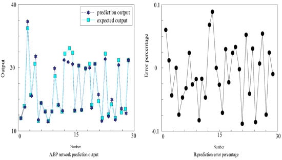 First, 450 samples (90% of the total) that are the same as the previous section were selected as the input of the neural network. After that, the initial simulation and training learning of the BPNN were carried out in the MATLAB toolbox until the average error was less than the value set when the model was established at the beginning. At this point, the BPNN would stop training. Then, 30 sample data (accounting for 6% of the total) were selected for verification. At the end, the system would generate line graphs such as prediction error percentage, expectation and prediction output comparison. The training results of the model are shown in Figure 8.