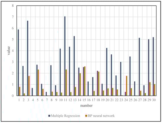 The following article compares the error value of the BPNN model with the error value predicted by the multiple regression model. The comparison results are shown in Figure 9: