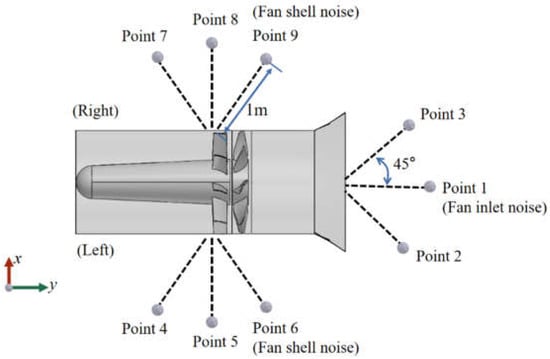 The noise measurement in this experiment refers to GB/T2888-2008 [28]. Nine distributed measuring points are selected and divided into two types: one is fan inlet noise measurement points, the other is the symmetrical shell noise measurement points, as shown in Figure 2. According to the serial number of the measuring points, the noise information is measured in sequence. The angle between each measuring point and the central axis of the fan is 45°, the distance is 1 m, the standard error of noise measurement sound level is 2 dB(A), and the sampling time is 15 s. The background noise in the experimental period is much less than the experimental noise. According to the relevant provisions of GB/T2888-2008, the measurement results do not need to be corrected.