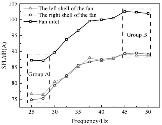 The variation trend of noise SPL at different positions (fan inlet and shell) is the same. The rule of noise and the frequency of the left and right shell is as follows. In Group A, the left noise SPL is larger, and in Group C, the right noise SPL is larger.
