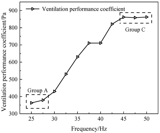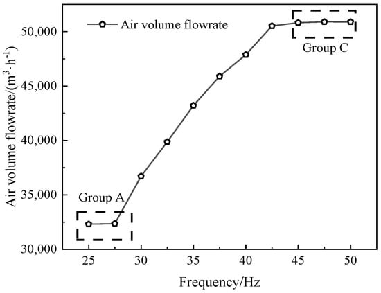 In Figure 4, it is also found that the air volume is non-proportional to the frequency. In Group A and C, the trend of the air volume is opposite to that of the noise: the air volume increases slowly with the change of frequency. In Group B, there are two stages for noise change, but the air volume increases in approximately equal proportion. There are non-equal proportional changes and characteristics in various OC.