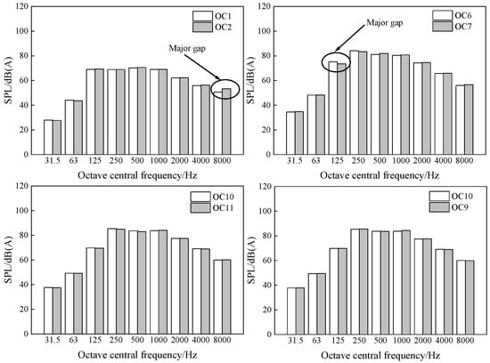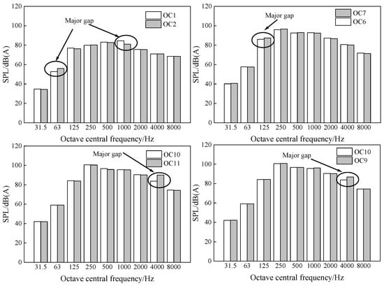 In Figure 3, the amount of change on the horizontal axis is the selected 11 OC. On the left vertical axis, it is “sound pressure level”, its unit is “dB(A)”, and “dB(A)” represents the A weighting SPL. The maximum error of SPL of each measuring point under all OC is not more than 3%. In Group A, the SPL of OC2 is lower than that of OC1, showing a decrease of 0.3%. In Group C, the SPL decreases with the increase of frequency among OC9, OC10, and OC11. The proportion of SPL decreased by 0.6% from OC11 to OC10. In addition, the growth rate of OC3 to 6 of SPL is much higher than that of OC7 to OC8. Bounded by OC7, the growth rate of noise SPL slows down, and the proportion of SPL decreased by 1.1% from OC7 to OC6