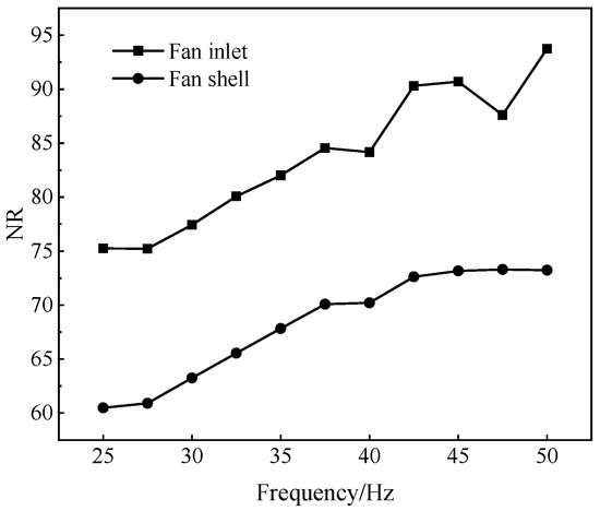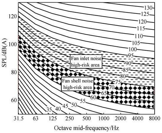 The human body has a different perception or damage of different frequency bands, which can be evaluated by using a noise rating (NR) curve [30]. A NR curve is a group of curve clusters divided according to octave to quantify the evaluation index. Usually, in the first step, 0~130 dB(A) noise is selected; in the second step, the octave range of 31.5–8000 Hz is divided into 9 octaves; in the third step, curve clusters are used for index quantification, and the NR evaluation number of noise is determined by the maximum SPL.