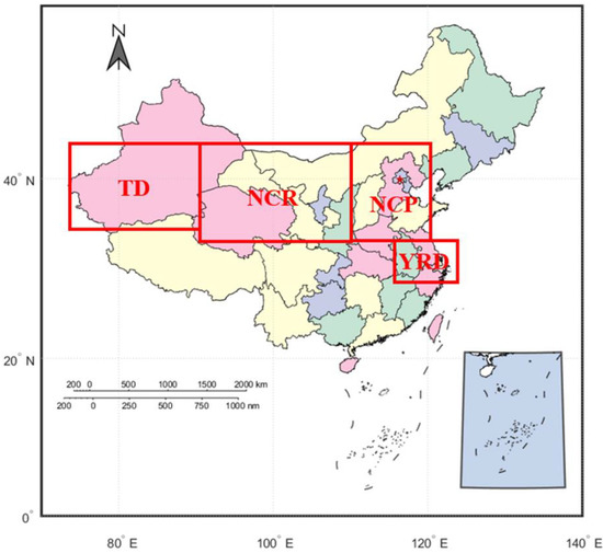 The TD (35–43° N, 75.5–90.5° E) is located in the Tarim Basin a large, closed mountain basin, surrounded by high mountains on all sides, and is the largest natural source of sand and dust emissions in China. Subsequent to sand and dust days, the dust is transported over long distances driven by cold, high pressure, and other air currents. The NCR (33–43° N, 90.5–110.5° E) includes most of the Gansu, Qinghai, and Shaanxi Provinces, which is a relatively harsh environment with overall poor vegetation cover and a large number of deserts. The NCP (33–43° N, 110.5–120.5° E) is the second largest plain in China, and is flat and open, with an average elevation of 50 m or less and many rivers, making it a typical alluvial plain. Studies have shown that the environmental quality of NCP has not been favorable because of its economic development and geographic factors, and its air quality continues to be poor [40,41]. The YRD (29–33° N, 116.5–122.5° E) is the primary economic zone in China, mainly located on the Taihu Lake Plain, in the lower reaches of the Yangtze River in China. The average temperature of the region is above 0 °C, which is typical subtropical monsoon climate. Externally transmitted pollutants along with local economic development and other anthropogenic activities have a large impact on air quality in the area [38] (Figure 1).