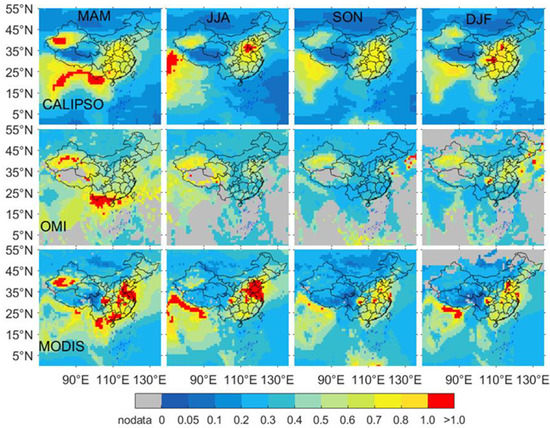 The spatial distribution of the 14-year average cylindrical AOD according to CALIOP, MODIS and OMI in MAM, JJA, SON and DJF in China was retrieved (Figure 2). The all AOD values observed by different sensors show an inconsistent spatial pattern, especially those estimated by OMI and MODIS. However, CALIPSO has better coverage of all AOD inversion than MODIS and OMI. For example, for the bright surface of northern Mongolia, Qinghai-Tibet Plateau, and parts of Southeast Asia in winter, MODIS and OMI data may be absent due to high surface reflectivity and sensor algorithm [50]. However, the long-term observation of CALIPSO can show the all AOD distribution characteristics of these regions well. It is worth noting that areas in which OMI cannot effectively monitor all AOD throughout the year are mainly located where these values are low, and all AOD values retrieved by OMI are high in low-value areas compared to the values obtained from CALIPSO and MODIS (such as in Mongolia). Whether all AOD inversion of OMI will be greatly affected when all AOD values are low requires further investigation.