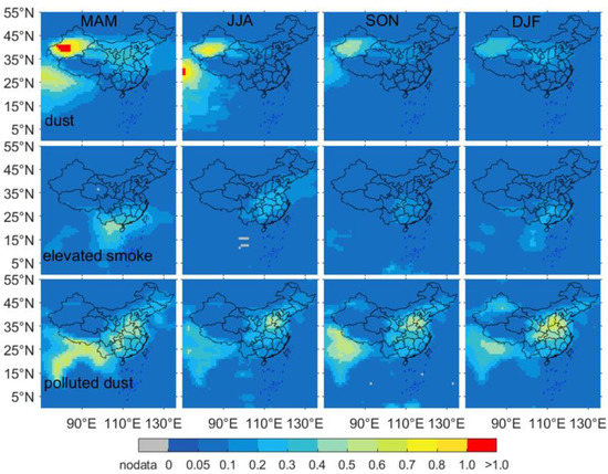 Average aerosol optical depth (AOD) distribution of dust, polluted dust, elevated smoke over China from 2007–2020 based on CALIPSO data. Rows represent aerosol types (dust, polluted dust, elevated smoke), columns represent seasons (MAM, JJA, SON, DJF).