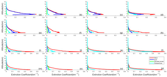 Seasonal vertical distribution of average extinction coefficient (red solid line), dust extinction coefficient (blue solid line), Elevated smoke extinction coefficient (green solid line), and polluted dust extinction coefficient (cyan solid line) for TD (a–d), NCR (e–h), NCP (i–l), and YRD (m–p) from 2007 to 2020.
