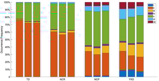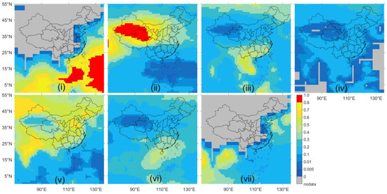 To further understand the spatial and temporal distribution of aerosol types in the study area, we investigated the average aerosol type occurrence frequency (OF) in the Chinese region from 2007 to 2020 (Figure 5). CALIPSO classifies aerosol types in the troposphere into seven subtypes by the scene classification algorithm [60]. The algorithm uses comprehensive attenuation backscattering and particle depolarization measurement, surface type, layer top and foundation height to identify aerosol subtypes. Where i–vii represent respectively clean marine, dust, polluted continental/smoke, clean continental, polluted dust, elevated smoke, and dusty marine. On the whole, the OF distribution of aerosol types in different regions has obvious differences. Clean- and dusty marine aerosols are mainly concentrated in the eastern part of China and decrease until they disappear further inland. Clean continental aerosols are mainly encountered in land areas, and the overall OF is low, with the lowest OF in the TD and NCR regions. The largest OF of dust aerosols is in the Qinghai region of TD and NCR, which then gradually decreased to the east. The overall dust aerosol levels in northern China are higher than those in southern China [53,54]. Notably, polluted continental/smoke aerosol levels are higher in southern than in northern China. Furthermore, from the OF distribution of polluted continental/smoke, it can be surmised that the high OF observed in the NCP and Northeast China may be influenced more by conditions in other countries. Polluted dust aerosol for TD is at a lower level in the study area, while levels observed in NCP and YRD are higher, which is consistent with the conclusion in 3.1. Elevated smoke aerosols are mainly distributed in the northeast and southeast regions of China.