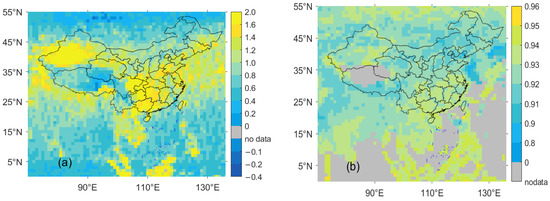 Spatial distribution of multi-year mean ultraviolet aerosol index (UVAI) and single scattering albedo (SSA) for 2007–2020 obtained based on the ozone monitoring instrument (OMI). (a): UVAI; (b): SSA.