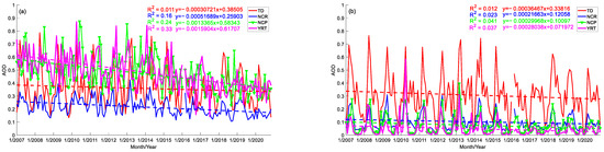 The seasonal variation of the AOD in NCR is different from that of the TD. In the NCR, all AOD retrieved by OMI is significantly different from that observed by CALIPSO and MODIS, especially in the east of NCR where the all AOD of OMI is high. In contrast, in the eastern part of the NCR, OMI all AOD values are higher than MODIS and CALIPSO, which may be due to three main reasons [6]: (1) the larger OMI pixels, which are often contaminated by clouds; (2) the assumption of aerosol profiles; (3) the incorrect setting of surface reflectivity. In contrast, YRD shows a high all AOD value all year round, but the values given by different sensors vary. The most obvious area in China without OMI values is the Qinghai-Tibet Plateau, and the all AOD value of CALIPSO inversion in the Qinghai-Tibet Plateau is lower than the value noted by MODIS. An important reason for the underestimation of all AOD by CALIPSO may be its low signal-to-noise ratio. The ability of CALIPSO to detect weak aerosol layers is diminished and highly diffuse and thin aerosol layers below the CALIPSO detection threshold may be ignored. Moreover, the 16-day sampling frequency of CALIPSO may lead to missed pollution events [52].