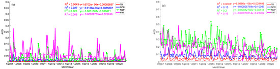 We plotted the multi-year monthly average changes of all, dust, elevated smoke, and polluted dust AOD values in the four study areas during 2007–2020. However, due to the lack of data in February 2016, there were data interruptions in 2016–2017. Seasonal variation of AOD varies greatly in different regions (Figure 7). From the change observed in all AOD values, we found that the all AOD of YRD fluctuates greatly over time, and the months with the maximum AOD value differs between years. The all AOD showed a downward trend in the four regions (−0.03% < slope < −0.18%), in which the downward trend of the YRD and NCP was more obvious (the slope of YRD fitting curve: −0.18%; the slope of NCP fitting curve: −0.12%),which is significantly related to the implementation of stringent long-term emission control measures in these regions in China from 2013 and 2018 [38]. The all AOD values of NCP and YRD are higher than those of TD and NCR. Furthermore, the all AOD value for NCP in summer is the highest, with the average value being up to 0.59 in several years. Elevated smoke AOD values in the four study areas are the highest in summer (JJA) followed in decreasing order by autumn (SON), spring (MAM) and winter (DJF). The lower values of elevated smoke AOD present in the TD and NCR indicate that these two regions are influenced less by industrial development and human activities. The TD is sparsely populated, but elevated smoke AOD and polluted dust AOD have shown a slight upward trend over the years, indicating that the contribution of human activities to pollution in remote areas has begun to increase in recent years. Notably, NCR, NCP, YRD elevated smoke- and polluted dust AOD values show a downward trend from 2007 to 2020, but the elevated smoke AOD of YRD is still much higher than that of the other three regions. The higher elevated smoke AOD in YRD is due to the greater contribution of transportation, industry, and biomass burning in YRD to the regional elevated smoke AOD [72]. Kang et al. [37] showed through a backward trajectory model study that some of the YRD cities in the MAM would be influenced by dust in northern and northwestern China, leading to an increase in AOD in the region. A weak upward trend is observed for TD elevated smoke- and polluted dust AOD values from 2007 to 2020. The all- and dust AOD values of MAM TD and NCR are higher than those of other seasons in the entire year. Notably, in MAM, the monthly mean change of dust AOD in the four regions has a high consistency, while the local dust emission sources of NCP and YR are lower. Due to the intensification of MAM frontal activity and dry and windy weather, dust enters the atmosphere under the action of wind [34], So the dust of TD and NCR will be transmitted to NCP and YRD, resulting in the high consistency of the MAM dust variation trend of TD, NCR, NCP, and YRD. According to the trend chart of polluted dust AOD changes over the years, NCP annual polluted dust AOD is generally higher than that of the other three regions. In DJF, the polluted dust AOD change trend of TD, NCR and NCP is highly consistent.