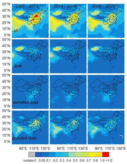 Changes in the dominant extinction coefficient profiles in the four regions, TD, NCR, NCP, and YRD were observed for the three time periods 2007–2013, 2014–2018, 2019–2020 (Figure 9). Overall, we found that the width of vertical distribution of TD, NCP, and YRD decreased per year, but this was not the case for NCR. The significant decrease in the dust extinction coefficient of TD in 2018–2020 may be mainly related to the 16-day sampling frequency period of CALIPSO, which may have lead to some missed dust events. However, the longer time span of 2007–2018 should resolve this problem. The width of vertical distribution of NCR did not decrease in 2013–2018 mainly due to the larger polluted dust extinction coefficient near 1 km, but with the increase of height, the extinction coefficient was significantly smaller than that observed in 2007–2013. Consequently, the overall extinction coefficient is still decreasing. The decrease in the width of the vertical distribution of the all-extinction coefficient coefficients of NCP and YRD is also obviously related to the decrease of the polluted dust extinction coefficient, while the changes in elevated smoke and dust extinction coefficient are not obvious. In particular, the NCP and YRD, as important economic and population activity areas in China, are more responsive to pollution prevention and control policies, with maximum values of 0.62, 0.47, and 0.38 for NCP near-surface extinction coefficient and 0.57, 0.41, and 0.34 for YRD in 2007–2013, 2014–2018, and 2019–2020, respectively.