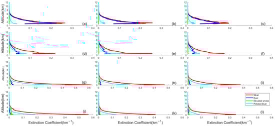Seasonal vertical distribution of average extinction coefficient (red solid line), dust extinction coefficient (blue solid line), Elevated smoke extinction coefficient (green solid line), and Polluted dust extinction coefficient (cyan solid line) for Taklimakan Desert (TD) (a–c), North central region of China (NCR) (d–f), North China Plain(NCP) (g–i), and Yangtze River Delta (YRD) (j–l) for 2007–2013, 2014–2018, and 2019–2020.