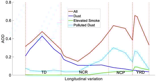 Taklimakan Desert (TD, 75.5–90.5° E), North central region of China (NCR, 90.5–110.5° E), North China Plain (NCP, 110.5–120.5° E), and Yangtze River Delta (YRD, 116.5–122.5° E) with longitude all, dust, elevated smoke, polluted dust aerosol optical depth (AOD).