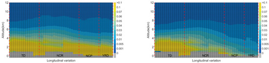 The horizontal and vertical distributions of TD, NCR, NCP, and YRD aerosol properties were studied using CALIPSO L3 aerosol data from 2007 to 2020, and the effects of China’s pollution control policies on AOD, aerosol types and extinction coefficients in the study area were analyzed. The main findings of this paper are as follows.