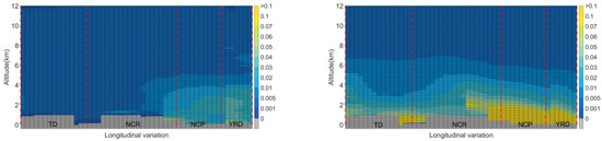 The main aerosol type in TD at different altitudes is dust, especially in MAM, JJA and SON, where the extinction coefficient value of dust is close to the all-extinction coefficient value. In DJF, the 4–6 km extinction coefficient range decreases significantly, and in addition to dust aerosols, the contribution of polluted dust is also larger at 0.8–4 km. The seasonal variation of extinction coefficient in NCR is very obvious, and during MAM, the distribution patterns of all-, dust- and polluted dust extinction coefficients are basically the same, while during JJA, elevated smoke aerosols also start to appear, and the aerosol types are more complex. Below 2.8 km in the NCR during JJA, SON and DJF, polluted dust aerosol extinction coefficient values are larger than that of dust aerosol, while above 2.8 km they show different patterns. For instance, the amounts of dust aerosol are larger than polluted dust aerosol during JJA, while polluted dust and dust extinction coefficients are more similar during SON. During DJF, dust aerosol makes a larger contribution than polluted dust aerosol above 3 km. Unlike for TD and NCR, all extinction coefficient peaks for NCP and YRD are closer to the ground, the extinction coefficient layer is mainly concentrated under 4 km, and the contribution of polluted dust aerosol is obvious throughout the year. We found that high values of extinction coefficient are mainly located in NCP and YRD, while NCP DJF polluted dust extinction coefficient is the largest, mainly because DJF coal-fired heating emits a large amount of aerosol particles, accompanied by a strong inversion temperature and stable atmospheric boundary layer in DJF which impedes diffusion of pollutants [58].In MAM and DJF, NCP and YRD dust extinction coefficients are higher in the 0–2 km zone, and the values observed during MAM is higher than those noted during DJF, which is correlated with dust transport in the NCR under certain meteorological conditions [38].Elevated smoke aerosols in JJA over the NCP surpasses polluted dust aerosols above 2 km, while in the YRD elevated smoke aerosols are already obvious near the surface and appear higher than polluted dust. It is worth noting that although the YRD elevated smoke aerosol extinction coefficient is significantly weakened in SON, the elevated smoke aerosol extinction coefficient is still larger than that of polluted dust at 2 km overhead.