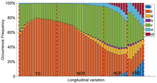 2007–2020 Occurrence Frequency (OF) changes of seven aerosol types of Taklimakan Desert (TD, 75.5–90.5° E), North central region of China (NCR, 90.5–110.5° E), North China Plain (NCP, 110.5–120.5° E), and Yangtze River Delta (YRD, 116.5–122.5° E). Letters i–vii represent clean marine, dust, polluted continental/smoke, clean continental, polluted dust, elevated smoke, and dusty marine.