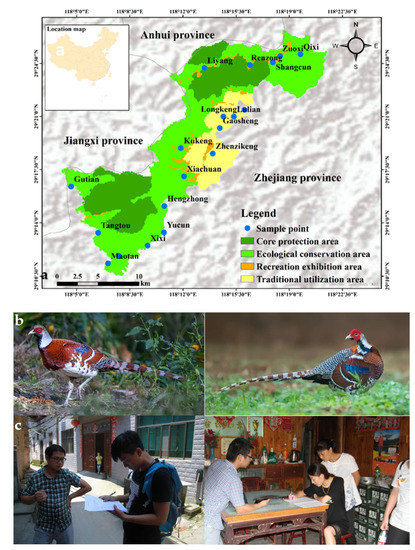 Elliot’s pheasant (Syrmaticus ellioti) belongs to the genus Syrmaticus in the family Phasianidae and is a typical ground-nesting forest bird. It is an endemic national first-level protected animal in China. It is listed as “near threatened” on the International Union for Conservation of Nature’s Red List and “vulnerable” on China’s Vertebrate Red List [23]. Elliot’s pheasant has become a threatened species of widespread concern, as the population has declined because of habitat fragmentation, deforestation, shrinking of suitable habitat areas, and massive hunting in the past [23]. The existence of the Elliot’s pheasant is the prerequisite for its impact on ecosystems and economic systems and human utilization, and the protection of the Elliot’s pheasant should be rooted in the existence value of the species. Therefore, the accurate evaluation of the existence value of the Elliot’s pheasant is not only beneficial to the protection of the Elliot’s pheasant, it is also the further clarification of other economic, social and ecological values attached to the existence value of the Elliot’s pheasant. Therefore, the use of the CVM to assess the economic value of endangered species conservation provides an essential scientific basis for decisions on endangered species management [4]. In 2011, the China Wildlife Conservation Association awarded Kaihua County, Zhejiang Province the title “Hometown of Elliot’s pheasant in China”. In 2016, the National Development and Reform Commission officially approved the construction of the Qianjiangyuan National Park (QNP) System Pilot Area. Hence, QNP was the area examined in this study. This study assesses willingness to pay for Elliot’s pheasant conservation, providing suggestions for management strategies for rare and endangered species in the study area. We specifically aimed: (1) to understand the level of local residents’ support for Elliot’s pheasant conservation and associated factors; (2) to analyze the conservation value of Elliot’s pheasant by CVM, and (3) to clarify the factors affecting this WTP, and explore the influencing factors and underlying reasons of WTP.