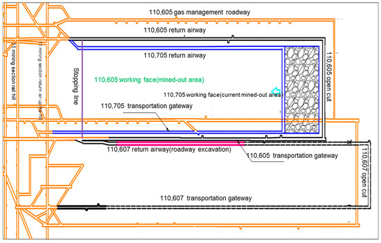 Although many scholars have performeda lot of research on the theory and control measures of surrounding rock in roadway excavation, they have achieved fruitful results [20,21,22]. However, in recent years, with the improvement of mining intensity and the tension of mining replacement, the phenomenon of face-to-face mining has often occurred. Under the influence of strong mining, there are few studieson the technology of strict control of small coal pillars with roof-cutting and pressure relief. Therefore, this paper takes the A110607 return airway of the coal mine of Guizhou Panjiang Coal and Electricity Group as the research background, and carried out research on roof-cutting and pressure relief control technology of strong mining small coal pillar roadway excavation.