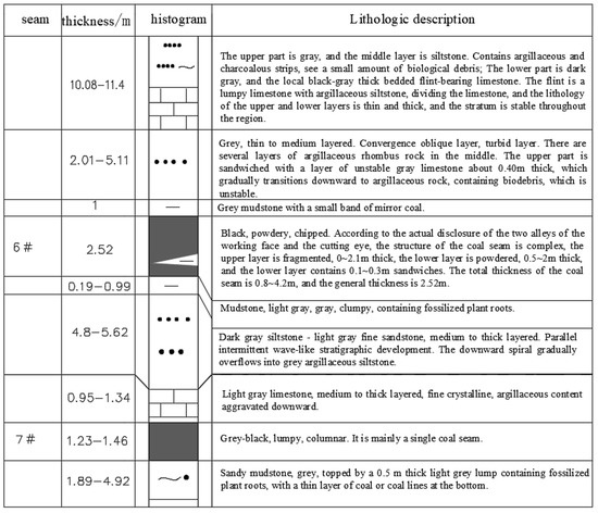 The thickness of the coal seam in the A110607 working face is 1.2–3.1 m, with an average thickness of 2.5 m and an average dip angle of 8°, which is a preparation working face. The lower part is Coal Seam 7#, and the existing working face A110705 is about 9 m away from the 6# layer. The A110607 return airway is driven along the mined-out area and along the roof of the 6# coal seam. The total work quantity is 921.5 m, and the buried depth is about 190 m. The location of the working face is shown in Figure 1. The roof and floor strata of the coal seam are mainly composed of mudstone and argillaceous siltstone. The roof and floor strata of the coal seam are shown in Figure 2. In order to reduce the amount of excavation and support costs, while recycling coal resources as much as possible, the return airway (trapezoidal roadway width × medium height = 5.2 m × 2.8 m) was used to implement small coal pillar roof-cutting pressure relief.