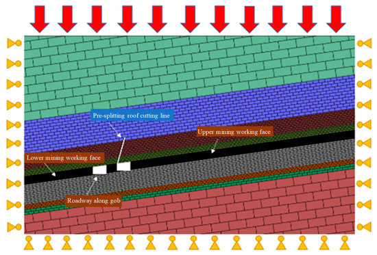 In order to study the influence of mined-out area roof caving and roadway surrounding rock stability under different roof-cutting heights and different coal pillar widths of roadway excavation under strong mining, according to the engineering geological background of the A110607 return airway, the numerical calculation model is established by using discrete element software UDEC. The model size is 100 m × 60 m, as shown in Figure 3. The bottom boundary of the model and the surrounding are constrained, and the top is a free boundary, applying 4.8 MPa vertical stress (uniform load). The Mohr–Coulomb model is used for rock blocks and the Coulomb slip model is used for joints. The physical and mechanical parameters of simulated coal strata are shown in Table 1. The contact characteristic parameters of blocks are shown in Table 2.