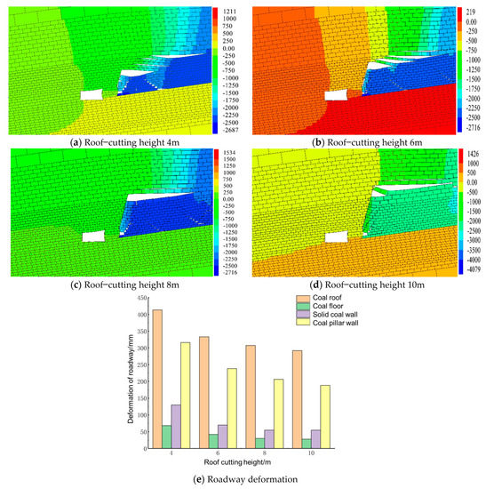 (1) Figure 4 is the displacement cloud and roadway surrounding rock deformation histogram under different roof-cutting height. As can be seen from Figure 4, when the roof-cutting height is 4 m, due to the small height of the roof-cutting, the overburden strata in the mined-out area are separated, and the rock blocks rotate to form a hanging roof, which does not completely cut off the stress transfer of the overburdened strata, resulting in the deformation of the roadway surrounding rock and the coal pillar gradually increasing, which has an adverse effect on the maintenance of the roadway surrounding rock. At this time, the maximum deformation of roadway roof is 413 mm, and the deformation of solid coal wall and coal pillar wall are 130 mm and 316 mm, respectively. When the roof-cutting height is 6 m, the roof-cutting range is within the range of the immediate roof. After the roof-cutting, the roof of the mined-out area collapses and sinks along the pre-splitting cutting seam line. However, at this time, the immediate roof does not completely cut down. Instead, a large separation layer is generated between the immediate roof and the overlying strata, which is in a hanging roof state. Once it collapses, it will affect the stability of the roadway. At this time, the maximum deformation of roadway roof is 333 mm, and the deformation of solid coal wall and coal pillar wall is 70 mm and 238 mm respectively. When the roof-cutting height is 8 m, the cutting line runs through the direct roof to part of the basic roof. After the roof-cutting, the roof of the mined-out area collapses smoothly along the cutting line, and the caving rock can effectively support the basic roof of the rotation. The maximum deformation of the roof is 307 mm, the movement of the solid coal wall is 55 mm, and the movement of the coal pillar is 206 mm; when the roof-cutting height increases to 10 m, the caving range of the overlying strata in the mined-out area increases, and the basic roof can fall smoothly along the slit line. Compared with the roof-cutting height of 8 m, the maximum deformation of the roof, coal pillar wall and solid coal wall does not change much, and the overall deformation of the roadway is small, which is beneficial to the maintenance of the roadway. It is found that increasing the roof-cutting height has little effect on the stability of the roadway.