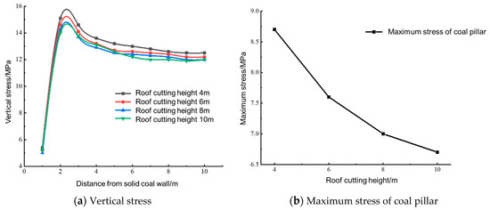 (2) Figure 5 shows the stress cloud, the stress curve of solid coal wall and the maximum stress diagram of coal pillar under different roof-cutting heights. It can be seen from Figure 5 that when the roof-cutting height is 4 m, the peak stress of the solid coal wall is 15.8 MPa, and the peak stress is about 2.2 m from the solid coal wall of the roadway, and then gradually decreases and tends to be stable. The hanging roof formed by the uncollapsed immediate roof and the main roof on the side of the coal pillar leads to a large range of high stress areas in the coal pillar, resulting in stress concentration. The peak stress of the coal pillar is 8.7 MPa. The large stress concentration will make the coal pillar unable to support the weight of the overlying strata, thus a large area of piece, coupled with the impact of strong mining, the roadway is prone to large amounts of deformation and instability, which brings difficulties to the maintenance of the roadway. When the roof-cutting height is 6 m, the peak stress of the solid coal wall is 15 MPa, which is consistent with the 4 m, and the mechanical transmission of the mined-out area roof is not completely cut off, resulting in the increase of the separation of the immediate roof and the main roof above the mined-out area. When the roof-cutting height reaches 8 m, the stress connection above the coal wall and above the coal pillar is weakened, and the peak stress is reduced. The peak stress is 14.2 MPa and 7 MPa, respectively. The peak stress concentration in the solid coal wall is 2.2 m–2.5 m away from the roadway side. When the height of roof-cutting increases to 10 m, it has little effect on the stress distribution because of the basic collapse.