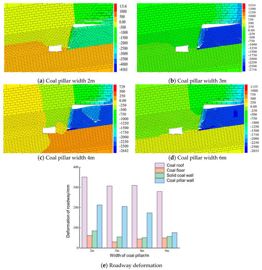 (1) Figure 6 shows the displacement cloud and the deformation histogram of roadway surrounding rock under different coal pillar widths. It can be seen from the figure that along the direction of roadway roof and floor: with the increase of coal pillar width, the roof deformation decreases first, then increases and then decreases, showing a wave-shaped change. When the width of coal pillar is 2–3 m, the deformation of roof decreases from 352 mm to 307 mm, and when the width of coal pillar is 3–4 m, the deformation decreases by 30 mm. The deformation of the floor also decreases first and then increases. When the width of the coal pillar is 2–3 m, the deformation decreases from 62 mm to 30 mm, and when 3–6 m, it shows an increasing trend, which is not conducive to roadway maintenance. Along the direction of the roadway side: the deformation of the solid coal wall decreases first and then increases with the increase of the width of the coal pillar, showing a step wave change. When the width of the coal pillar is 2–3 m, the deformation is reduced from 85 mm to 55 mm, and the deformation is not obvious when the width of the coal pillar is 3–6 m; the deformation of the coal pillar wall gradually decreases and changes linearly. When the width of the coal pillar is 2–3 m, the deformation increases from 213 mm to 206 mm. When the width of the coal pillar is 3–6 m, the deformation gradually decreases to 76 mm.