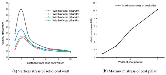 Stress cloud and solid coal wall stress curve and maximum stress diagram of coal pillar under different coal pillar widths.