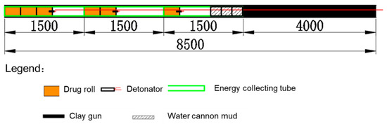 To explore the pressure relief effect after pre-splitting roof-cutting blasting. Determination of reasonable blast hole spacing, explosive quantity and charge structure and other blasting parameters, the scene through the 500 mm, 600 mm, 700 mm, 800 mm, 900 mm five different blast hole spacing with 321 charge structure using coal mine allowable three-stage emulsion explosive (specification 35 mm × 300 mm/roll, each roll weight 333 g) with energy collecting tube, tube length 1500 mm, outer diameter 42 mm, inner diameter 36.5 mm, pre-splitting blasting test, the use of charge for pre-splitting blast hole. The cutting effect was observed by borehole peeping in the holes without charge between blasting holes. The charge structure is shown in Figure 8.