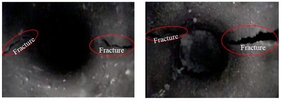 After the field test, according to the test results, the integrity of the roof after blasting is good, and the orifice is not collapsed and deformed by blasting impact. When the blasthole spacing is 500 mm, 600 mm, 700 mm and 800 mm, there are obvious conductive cracks in the peephole. The cracks in the hole are symmetrically distributed and relatively straight, and the crack rate is above 85%. When the blasthole spacing is 900 mm, a conductive crack appears in a peephole, and the crack rate is only 15%.Finally, the blasthole spacing is determined to be 800 mm, the 321 charge structure is used in the complete roof position, and the 221 or 211 charge structure is used in the broken roof and geological structure zone. Borehole peeping is shown in Figure 9.
