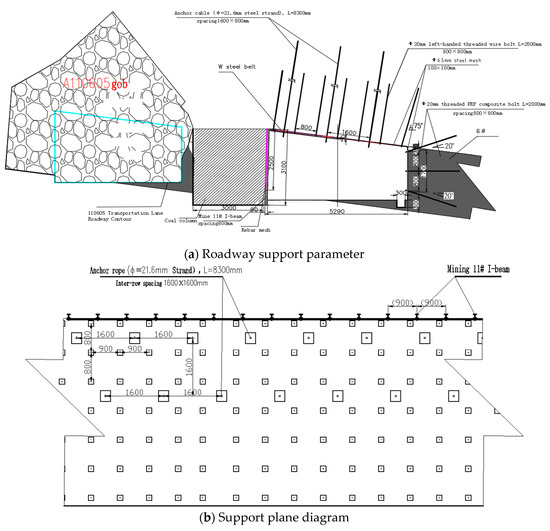 As shown in Figure 10, the roof is supported bythe “bolt + steel mesh + anchor cable + W steel strip”, and the bolt is supported by left-handed non-longitudinal reinforcement thread bolt (φ = 20 mm, L = 2500 mm). The row spacing between bolts is 800 × 800 mm; the anchor cable adopts φ = 21.6 mm, L = 8300 mm, and the row spacing between anchor cables is 1600 × 800 (1600) mm; each piece of the W steel strip is 4.5 m long and supported with anchor cable. The anchor cable is constructed in the steel strip hole. The Φ = 6.5 mm steel mesh is used, the specification is 1700 × 900 mm, the grid is 100 × 100 mm, the lap length of the steel mesh is ≥100 mm, and the interval between the lap parts of the steel mesh is 200 mm. The two strands of No.14 wire are tied and fixed.High side using “I steel + steel mesh” support, I steel length 3.1 m, spacing (center distance) is 0.8 m, steel mesh Φ = 6.5 mm, specification 1700 × 900 mm, grid is 100 × 100 mm. The low side is supported by anchor net. The anchor rod is glass fiber reinforced plastic composite anchor rod (φ = 20 mm, L = 2000 mm), and the row spacing is 800 × 800 mm. Each anchor rod adopts two MSCK2335 resin anchoring agent as end-anchoring. Reinforcement mesh with Φ = 6.5 mm, specification is 1700 × 900 mm, the grid is 100 × 100 mm, reinforcement mesh lap length is 100 mm, reinforcement mesh lap position interval 200 mm using two strands of 14 wire tied fixed.
