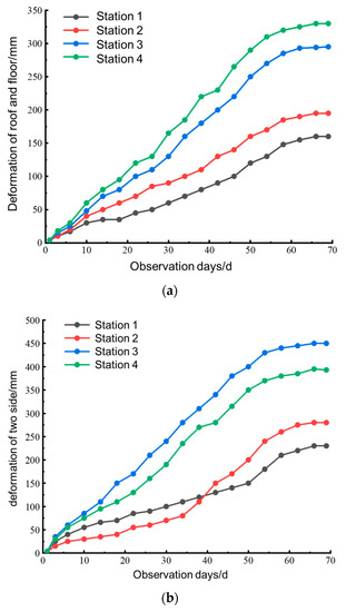 In the roof-cutting and uncut sections of the excavated roadway in the A110607 return airway, it is divided into two parts for monitoring. Starting from the position of the entry test roadway section, one station is added for each 50 m excavation, two stations in the roof-cutting section, and two stations in the uncut section.The cross-point placement method is used to monitor the distribution of roadway points. The monitoring results are shown in Figure 11. It can be seen from the figure that the deformation of roadway is related to the deformation time during the roadway excavation with roof-cutting and pressure relief. The deformation of two sides and roof of A110607 return airway increases nonlinearly. In 0–70 days, the deformation of two sides of 3# station in the uncut section of roadway increases from 0 to about 450 mm, and the deformation of roof and floor increases from 0 to about 300 mm. The deformation of the two sides of the 4# station increases to about 400 mm, and the deformation of the roof and floor increases from 0 to about 350 mm. After that, the deformation of the two sides and the roof and floor of the A110607 return airway gradually stabilized, and the deformation trend of the roof and floor and the two sides of the roadway gradually slowed down. In the range of the roof-cutting section, because the roadway is cut off by the roof of the mined-out area side to form a stable structure, the stress of the roof of the A110607 return airway is reduced, and the deformation of the roadway is weakened. Under the action of roof-cutting and pressure relief, the deformation of the roadway is greatly reduced, and the maximum deformation of the two sides is maintained at about 240–280 mm, which is about 44% of the deformation of the roadway without roof-cutting. The deformation of roof and floor increases from 0 mm to about 200 mm, which is about 38% of the deformation of roadway without roof-cutting. In general, after the improvement of roof-cutting pressure relief and support mode, the surrounding rock control of A110607 return airway in the roof-cutting pressure relief section during roadway excavation is better. Compared with the non-roof-cutting section, the deformation of surrounding rock is small, and the effect of roof-cutting pressure relief along the mined-out area is better. The roadway control effect is shown in Figure 12.