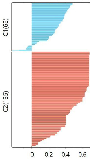 As discussed in the introduction, one of the main purposes of this study is to assign each participant in the online course to a relevant group that shares common engagement patterns. For clustering, a k-means clustering algorithm is adopted, and the perceptions of behavioral, emotional and cognitive engagement are used as features. The scheme of measuring distance is set to “Euclidean”. The number of clusters (k) is internally assigned in Orange, and the silhouette score is computed for each cluster case ranging from 2 to 8. In general, each value of k yields a different overall average silhouette score for the entire plot, and one possible way to choose an appropriate k value is such that the overall average silhouette score is as large as possible [40]. Table 5 lists the silhouette scores evaluated for each number of clusters k, and it indicates that k = 2 provides the largest silhouette score among the seven cases considered (k = 2~8). From this result, clustering with k = 2 was selected and analyzed in this study. Silhouette plot with k = 2 and silhouette score for generated clusters are shown on Figure 1. The averages of silhouette scores of Clusters 1 and 2 are 0.58 and 0.65, respectively.