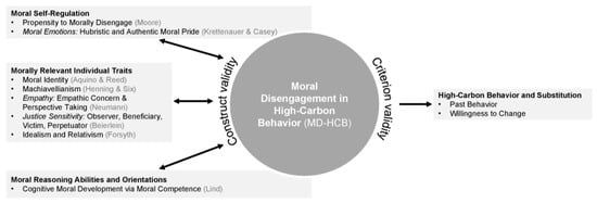 In particular, the research by Moore et al. [34] has convincingly shown the strength of the propensity to morally disengage as a predictor of unethical behavior and therefore partially functions as a blueprint for our instrument development applied to the area of high-carbon behavior. We agree that it is necessary to investigate how the propensity to morally disengage relates to other individual constructs, such as morally relevant individual traits, moral reasoning abilities including cognitive moral development, and selected dispositional moral emotions, which can subsequently finally be integrated into a strong overarching theoretical framework [34].