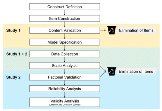 This article reports a series of two studies documenting the development and validation of the proposed interpretation (indicating the proclivity to morally disengage in high-carbon behavior) of this new scale, called the moral disengagement scale for high-carbon behavior (MD-HCB). The steps of the scale construction and validation process are depicted in Figure 3 (inspired by Kenzie et al. [72]). After defining the construct (see above), we designed a unidimensional 18-item scale that measured nine proposed moral disengagement strategies in the area of high-carbon behavior (MD-HCB-18). Based on the content (face) validity (Study 1) and the results of scale analyses (Studies 1 and 2) and confirmatory factor analyses (Study 2), we reduced this scale to a more compact 9-item scale with equal, or even superior, psychometric quality (unidimensionality, reliability) in addition to reduced length (MD-HCB). Again, following Moore et al. [34], the construct validity of the interpretation from this reduced scale was subsequently examined by studying its correlations to related constructs measured with established scales (Study 2). These included Moore et al.’s [34] scale for general moral disengagement (convergent validity), as well as the set of scales used by Moore et al. to validate the interpretations from this scale (discriminant validity; Machiavellianism, moral identity, idealism, and relativism, moral competence, moral identity, perspective taking and empathetic concern). To enrich the discriminant validation, we included scales for justice sensitivity and moral pride. Finally, we examined the explanatory capacity of the new scale for explaining past low-carbon behavior (LCB) and for predicting intentions to engage in such behavior in the future (Study 2).