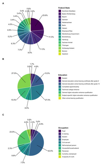 Due to quality concerns related to the relative speed index (RSI; cf. [74]), we removed 46 panelists who completed the task too quickly (RSI > 2) compared to the majority of the other participants. Moreover, because of social desirability concerns, 12 more participants were excluded due to an increased social desirability score. Therefore, the final sample for the validation study comprised 174 participants: 91 females and 83 males (age M = 49.9, SD = 17.5, range = 16–80 years). All 16 federal states of Germany (Figure 4A) as well as different educational backgrounds (Figure 4B), and occupations (Figure 4C) were represented in the sample.