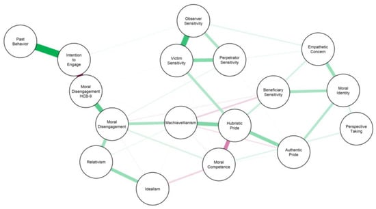 Because the propensity to morally disengage is closely linked to feeling distressed [34,36], it is beneficial to investigate the degree to which dispositional moral emotions are part of its network (see Figure 2). Since moral emotions are identified as key aspects driving ethical conduct [37,38], we are in line with Moore et al. [34] that the propensity to morally disengage is related to certain dispositional moral emotions. In addition, moral emotions are inherently linked to a further important concept, namely moral identity (see below). In the two studies, we focus on pride and elevation and integrate the concept of Krettenauer and Casey [39], who distinguish between authentic pride (focusing on the “self-in-action” and tied to a specific situation) and hubristic pride (focusing on the “self-as-actor” and generalized across situations). Krettenauer and Casey found that authentic pride positively predicted moral behavior, whereas hubristic pride undermined it. Moral elevation is regarded as an emotional reaction to acts of moral beauty (e.g., acts of kindness, charity, or compassion; [37,40]) whereby elevation can be regarded as the opposite of disgust [41,42] because it transmits positive feelings to a person [43]. Moral elevation was found to activate moral behavior, as it lets people admire and emulate a role model they observed [44,45].
