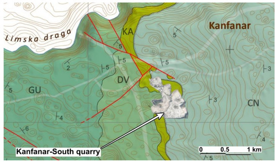 - Matičec, D.; Bergant, S.; Fuček, L.; Palenik, D.; Korbar, T.; Vlahović, I.; Šparica, M.; Koch, G.; Prtoljan, B.; Galović, I.; et al. Basic Geological Map of the Republic of Croatia Scale 1:50 000—Sheet Rovinj 1; Hrvatski Geološki Institut (Zavod za Geologiju): Zagreb, Croatia, 2017; ISBN 978-953-6907-56-4. [Google Scholar]
