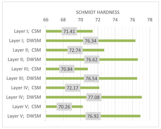 - The commercial blocks in the quarry have a uniform hardness, and no major variations were found in the blocks obtained from different quarrying layers. The average tested Schmidt hardness by mining layer was 76.34 for layer I, 76.62 for layer II, 76.54 for layer III, 77.08 for layer IV, and 76.92 for layer IV.