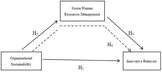 The results of the research in the literature show that no study relating to the effect of organizational sustainability on innovative behavior examining mediating human resources management has been conducted. A theoretical study of green human resources management for organizational sustainability as an innovative approach has been undertaken [70], which emphasized the importance of potential human resources activities for green companies and green human resources management through various human resources management functions in companies. There are studies available that tackle the variables with different variables. Some of the studies are as follows: Yong et al. [71] stated that green human resources management has a positive relation between social, environmental, and economic performance. Yong et al. [71] determined that the enhancement of green relational capital sustainability plays a mediating role in green human resources management. Al-Shammari et al. [72] conducted a study that examined the mediating role of green innovative behavior between green human resources management and sustainable performance. According to the results, green innovation has a significant effect on partial sustainability and also mediates the relationship between green human resources management practices and sustainability. The above-mentioned conceptual framework and empirical studies present a directly proportional relationship between mentioned variables. Setting off from the point that there is a directly proportional relationship with the variables which are mentioned in the study, the hypothesis below about green human resources management may have an indirect effect on the relationship between organizational sustainability and innovative behavior.