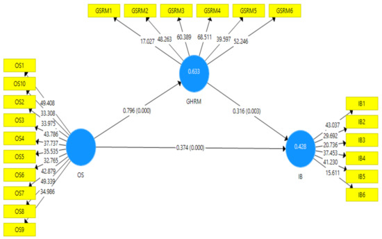 In the first stage, the significance of path coefficients was calculated by testing for the research model. An inspection of Table 4 shows that organizational sustainability (OS) supports the H1 hypothesis which is based on innovational behavior (β = 0.374; p = 0.000) and supports the H2 hypothesis which is based on the green human resources management ( and also supports H3 hypothesis which is expressed as green human resources management upon innovative behavior (β = 0.316; p = 0.001). In order to determine the Mediation Effect Analysis obtained by the bootstrapping method and to determine the mediation effect of the resulting analysis model, VAF values were interpreted.