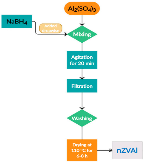 After reaction completion, the mixture was agitated for an additional 20 min to ensure that the reducing agent and the dissolved aluminum ions were completely reacted, forming the precipitated nZVAl. Following that, vacuum filtration was used to remove the produced nZVAl from the reaction medium. Afterward, the nanoparticles were thoroughly rinsed with distilled water, and then three times with ethyl alcohol, followed by drying the nZVAl in an oven at 110 °C for 6 to 8 h. The synthesized nZVAl surface was covered by a small amount of ethyl alcohol for storage, protecting the nanoparticles from further oxidation. The aforementioned steps are summarized in this flow chart (Figure 1).