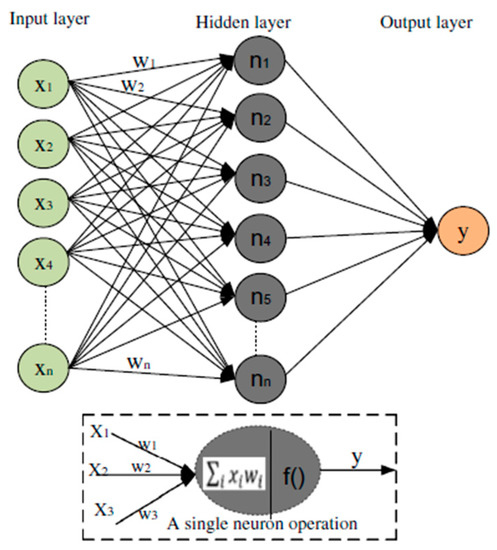Artificial intelligence-based techniques are employed for learning, modeling, and predicting a system’s performance. The artificial neural network (ANN) is one of these techniques, consisting of input, hidden, and output layers (Figure 2). The neurons in these layers describe the correlation between the input variables and the network’s layers [36,47]. Backpropagation is an iterative optimization process, where the loss function and evaluation metric are minimized by adapting the weight and bias between neurons. Mean squared error (MSE) (Equation (10)) was used as a loss metric for evaluating the backpropagation accuracy [28]: