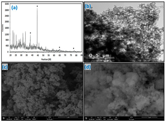 Figure 3c displays the SEM image of the unloaded nZVAl nanoparticles. The nanoparticles displayed an irregular surface feature with numerous unequal and noncircular pores. Additionally, certain nanoparticles adhered together (agglomerated), forming chain-like nanoclusters with diameters smaller than 100 nm. Such aggregates have also been noticed for nZVAl preparation [49]. However, this morphological feature was changed when water laden with Cu(II) contacted the nZVAl surface (Figure 3d). For instance, many pores disappeared and the empty zones were filled by Cu(II) ions. This change in surface morphology, with different sizes and shapes of aggregates, could reflect the high adsorption affinity of nZVAl toward Cu(II). In particular, some Cu(II) ions created an attached adsorbate film on the nZVAl outer surface, whereas others migrated through the nanoparticles’ interior voids.