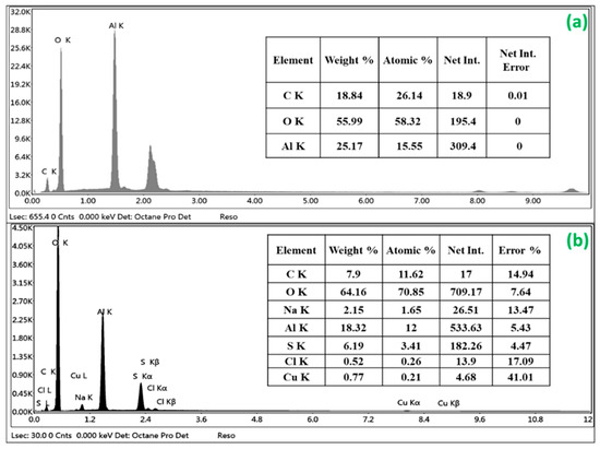 EDS spectra were employed to analyze the chemical composition of nZVAl before and after Cu(II) uptake (Figure 4a,b). The use of ethanol (C2H6O) during the washing step and/or the nZVAl incomplete oxidation because of material carrying, cleaning, and handling could be responsible for the existence of C and O components. The nZVAl sample consisted of 25.17% aluminum by weight. The presence of a prominent peak at 1.5 keV was mainly attributed to elemental Al, showing that the aluminum element represented the majority of the obtained sample’s composition. The formation of peaks for Na, S, Cl, and Cu in the EDS elemental pattern of the loaded adsorbent demonstrated that Cu(II) ions were adsorbed properly onto the nZVAl surface. Additionally, it is possible to recognize that the weight percentage of Al reduced from 25.17% to 18.32% (before and after Cu(II) adsorption). On the contrary, the weight percentage of O increased from 55.99% to 64.16%, respectively. As such, the nZVAl particles were further oxidized and a thicker shell of Al2O3 layers was formed.